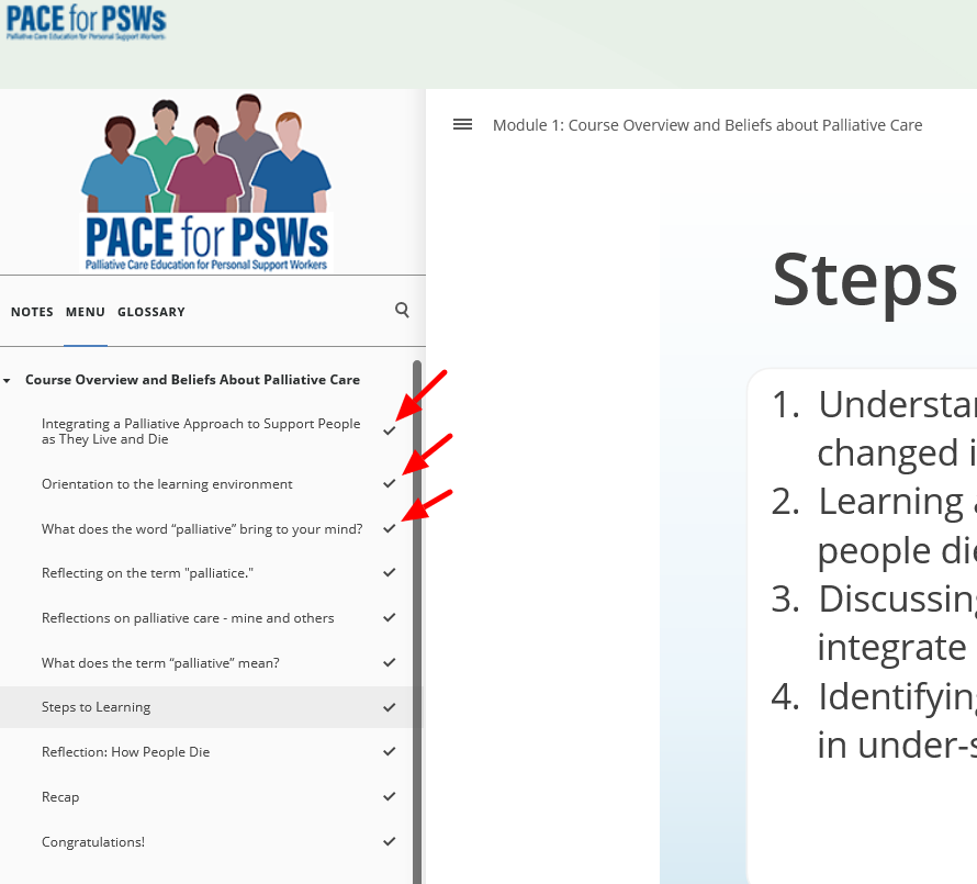 - A viewed slide will have a check mark beside it (Red arrows are pointing at the check marks).