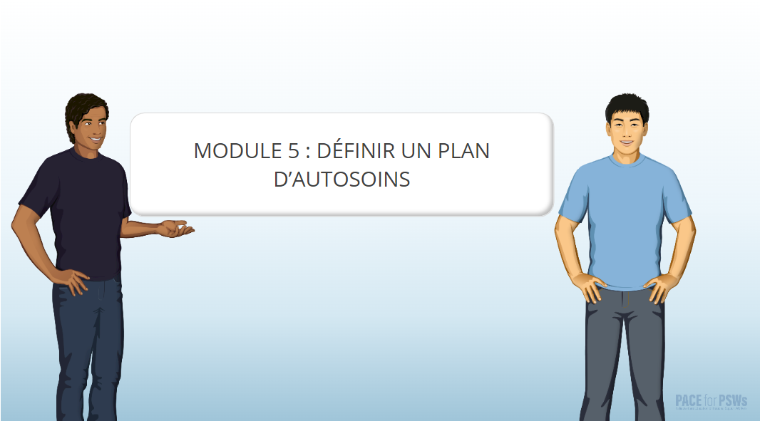 Dans ce dernier module, vous utiliserez les renseignements que vous avez recueillis sur vous-même et vos préférences, notamment par le biais de la grille d’évaluation des autosoins et de l’évaluation de votre niveau d’épuisement de compassion, pour élaborer un plan d’autosoins qui correspond à vos intérêts, à vos besoins et à vos capacités. Dans la deuxième partie du module, vous établirez un plan préalable de soins, qui aidera les soignants à connaître vos volontés s’il arrivait un moment où vous ne pourriez plus communiquer. Comme nous l’avons appris avec la COVID-19 au cours des dernières années – ou lorsque quelqu’un subit des blessures potentiellement mortelles –, il n’est jamais trop tôt pour créer un plan préalable de soins.