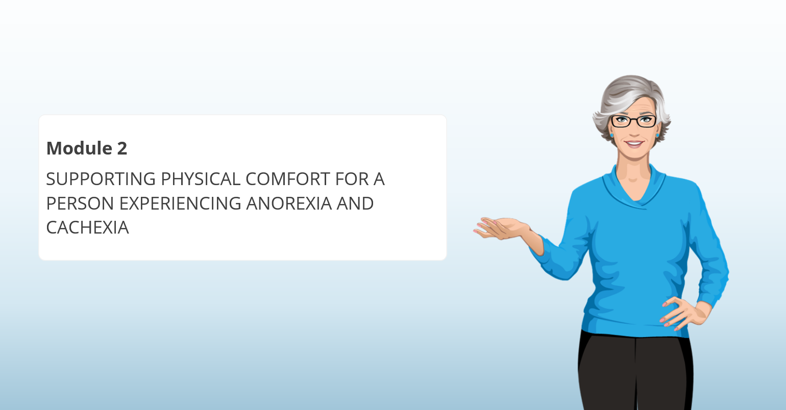 Module 2 describes anorexia in the context of its occurrence at end-of-life, and cachexia; two common symptoms that people may experience as they decline. You will learn ways to identify these symptoms, to gather information on the person's experience to report to the nurse and team, and ways to support comfort.